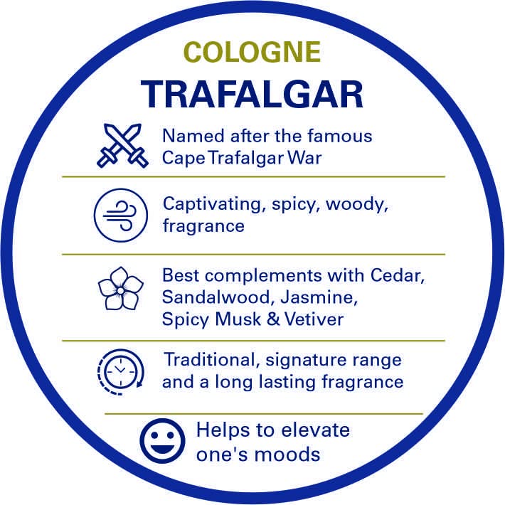 Fragrance and Notes: This Trafalgar Cologne perfume reveals its distinguished heritage with top notes of cedar and sandalwood complemented by subtle base notes of jasmine, spice musk and Vetiver.